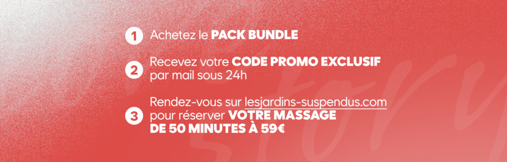 Les Jardins Suspendus : Votre offre massage vous sera envoyé par e-mail dans les 24h suivant l’achat de l’offre Bundle.